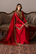 Drape yourself in the charm of red! The stunning shirt, crafted from luxurious silk is adorned with intricate gold hand embellishments, radiating opulence in every detail. Paired with effortlessly chic draped pants and a sheer organza dupatta featuring four-sided embroidered borders and a delicate sequin spray. This ensemble is a true embodiment of charm and grace.