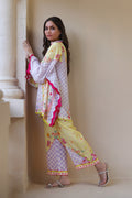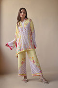 A crepe co-ord set exudes playful charm with its relaxed kurta, adorned in delicate pastel hues of lemon sorbet and lavender chequered pattern, artfully accented by floral motifs and vibrant hot pink 3D detailing. Paired with perfectly tailored culottes featuring a whimsical botanical print.