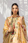 This elegant khaddi silk A-line shirt is crafted in a warm sand hue, complemented by a botanical print in earthy tones of terracotta, sage and olive. The print features floral motifs interspersed with delicate Mughal inspired elements and botanical illustrations. The neckline and sleeve cuffs are accentuated with contrasting crimson scallops for added definition. A matching organza dupatta with a scalloped edge and botanical print detailing enhances the look with soft movement. A pair of pure rawsilk printed culottes with scallop detailing on the hem homegenises the look.