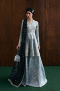 - Mercury grey printed velvet peplum with heavy embroidery on body and border. Full, fitted sleeves with embroidery and handwork.