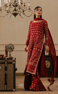 Make a lasting impression in our Maroon long shirt, a masterpiece of craftsmanship with its chiffon Kamdani work, exquisite gota laces and gota tassels . Paired with a matching gharara detailed with a banarsi boti and a crushed dupatta adorned with tassels, this ensemble is the epitome of elegance and sophistication, perfect for the discerning fashionista.