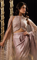 Witness the majesty of our net embroidered cape and blouse with a saree that sparkles with cut glass beads, sequins, and crystals. This breath-taking ensemble offers a contemporary twist to traditional elegance, making it the perfect choice for those who desire a touch of sophistication.