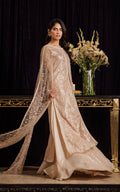 Shrouded in the luxe net embroidered front open dress. The long cape sleeves, adorned with shimmering crystals and sequins, cascade like moonbeams, exuding elegance and grace. Paired with a pearl embellished skirt, this ensemble is a true testament to luxury and sophistication.