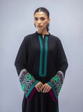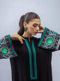 Make a statement with our sophisticated Black Kurta, brightened by a beautiful pop of teal. The detailed embroidery on the wide sleeves adds a unique touch. This outfit, complete with vibrant teal trousers, offers effortless style and modern elegance.